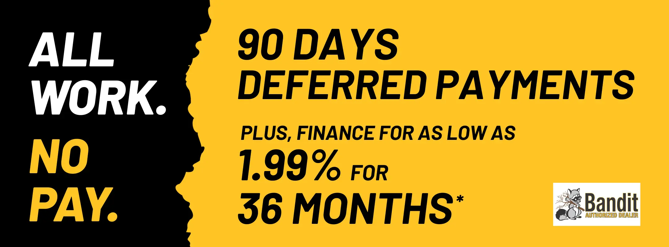 *Offer ends 12/31/2025. Valid for qualified buyers only. This program is intended for transactions up to $1,000,000.00 for all New Bandit Tree Care Equipment. Program is contingent upon final creditor approval. 90 day deferred payment options are available upon request. Available only through Bandit Industries and Oakmont Capital Services.