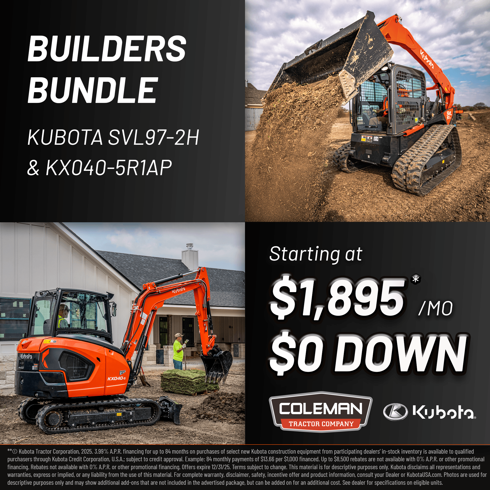 *Advertised price reflects pricing for in-stock, base model Kubota KX040-51R1AP package with 16" quick attach bucket and 24" quick attach bucket and Kubota SVL97-2H package with 48" forks and 80" tooth bucket as described above with no additional add-ons. Additional add-ons may be added separately at an additional cost. Taxes and insurance are not included in advertised pricing, if applicable. **© Kubota Tractor Corporation, 2025. 3.99% A.P.R. financing for up to 84 months on purchases of select new Kubota construction equipment from participating dealers’ in-stock inventory is available to qualified purchasers through Kubota Credit Corporation, U.S.A.; subject to credit approval. Example: 84 monthly payments of $13.66 per $1,000 financed. Up to $8,500 rebates are not available with 0% A.P.R. or other promotional financing. Rebates not available with 0% A.P.R. or other promotional financing. Offers expire 12/31/25. Terms subject to change. This material is for descriptive purposes only. Kubota disclaims all representations and warranties, express or implied, or any liability from the use of this material. For complete warranty, disclaimer, safety, incentive offer and product information, consult your Dealer or KubotaUSA.com. Photos are used for descriptive purposes only and may show additional add-ons that are not included in the advertised package, but can be added on for an additional cost. See dealer for specifications on eligible units.