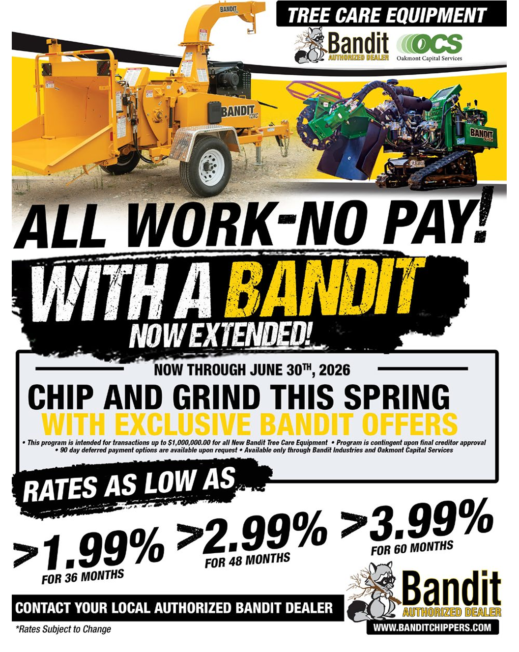 This program is intended for transactions up to $1,000,000 for all new Bandit tree care equipment. Program is contingent upon final creditor approval. 90 day deferred payment options are available upon request. Available only through Bandit Industries and Oakmont Capital Services. Valid through 6/30/2026.