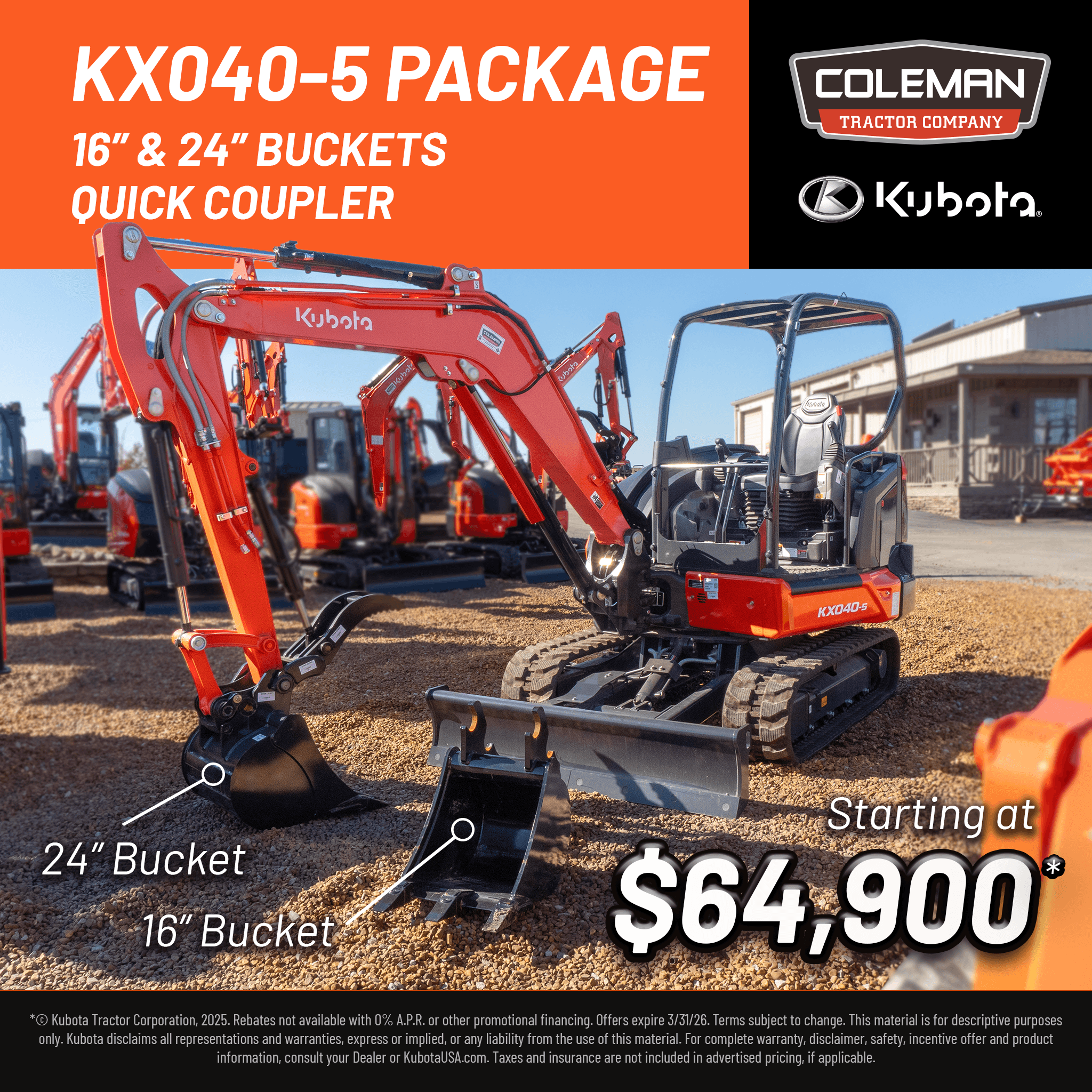 **Rebates not available with 0% A.P.R. or other promotional financing. Offers expire 3/31/26. Terms subject to change. This material is for descriptive purposes only. Kubota disclaims all representations and warranties, express or implied, or any liability from the use of this material. For complete warranty, disclaimer, safety, incentive offer and product information, consult your Dealer or KubotaUSA.com.